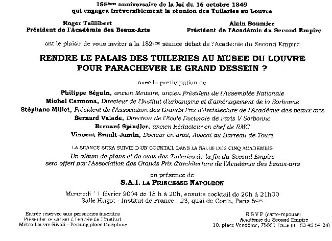 Accueil2. L'ensemble Louvre-Tuileries2.1.2. Photos des Tuileries2.1. Vues - Plans - Photos7. La reconstruction2.1.1. L'ensemble Louvre-Tuileries3. L'Histoire aux Tuileries4. Pourquoi reconstruire1. Le Comité National5. Dictionnaire des Tuileries2.1.3 Organisation de l'espace selon l'époquePlan du site8. Revue de presse2.1.5. Après l'incendie211.2 Vue d'ensemble (1857)211.1 Plan du 1er arrt (1860)1.8. Membres7.1. Les Tuileries au plan d'urbanisme212.1 Facade sur le Jardin (1858)9. AdhérerListe de diffusion211.3 Les Tuileries vues de la Concorde7.4. Avons-nous les plans6. A l'Institut211.4 Les Tuileries vues du grand bassin211.5 Les Tuileries vues du Louvre2.7. Visitons les Tuileries7.5. Le contraire d'un pastiche2.1.4. Plans d'architectes3.1. Monument de mémoire212.2 Grand Escalier (bas)212.5 Salon Louis XIV8.1. Les médias et les Tuileries212.4 Salon des Maréchaux213.7 Napoléon III212.6 Salle du Trône2.3. Histoire du Louvre5.1.3. Le Jardin des TuileriesContacts9.1. Formulaire français212.3 Grand Escalier (haut)215.1 Façade sur Jardin (en enfilade)2.2. Le Grand Dessein212.10 Galerie de la Paix (profondeur)2.9. Dispersion des ruines212.9 Galerie de la Paix (entrée)7.7. Double perspective inattendue212.7 Galerie de Diane212.8 Salon d'Apollon213.1 Louis XIV7.2. Principales dates2.8. De l'incendie à l'amputation4.10. Rétablir la perspective213.2 Louis XVIInfo légales3.3. Sous Louis XIV215.4 Depuis l'arc du CarrouselCrédits215.3 Pavillon central côté Jardin215.2 Façade sur le Jardin5.1.1. Grande Galerie213.4 Napoléon Ier2.6. Les Tuileries sous le Second Empire4.1. A méditer5.5 La résidence de Louis XVI5.10. Second Empire7.8. Coût - Aucun fonds publics7.6. Un parvis culturel de 2,6 ha2.5. La réunion des Tuileries au Louvre1.2. Grandes étapes depuis 20021.1. Pourquoi ce Comité ?4.2. Qu'en pensait Haussmann5.3. Les Tuileries de Louis XIV213.6 Louis-Philippe213.5 Restauration4.8. Rendre les Tuileries au Louvre4.9. Perspective manquante5.5.4. de 1789 à 17925.1. Au cours des siècles5.5.3. Manège des Tuileries7.3. Charte de Venise8.2. Texte des articles3.5. XVIIIè siècle : le palais des arts5.8. Restauration et Louis-Philippe1.7. Haut Conseil5.5.1. Retour de la Famille royale à Paris2.10. Bibliographie des Tuileries3.2. Au XVIè siècle6.1. Faut-il reconstruire les Tuileries ?5.3.2. Louis XIV5.10.2. Extensions et dépendances du Palais des Tuileries5.7. Consulat et Empire7.9. Investissement porteur d'avenir5.12. de 1883 à 20055.10.1. Accès et abords des Tuileries à la fin du Second Empire7.8 Qu'en sera le coût4.7. Un projet révolutionnaire5.2. La Renaissance213.3 Convention5.11. de 1870 à 18825.2.6. Philibert de L?Orme5.1.2. La Petite Galerie5.3.9. La Grande Demoiselle5.2.1. Les Tuileries au XVIème siècle5.10.3. Le chemin de fer des Tuileries4.3. Pétition émouvante en 18801.6. Conseil d'administration - Bureau5.2.3. Catherine de Médicis5.5.2. Hommage des Fédérés à Louis XVI5.3.8. Le Petit Appartement de Commodité2.4. Sous Louis-Philippe1.4. Chronologie des événements3.6. La musique aux Tuileries5.3.6. L?Appartement de la Reine5.2.4. Henri IV5.3.4. Le Grand Appartement3.4. Sous la Régence5.9. Deuxième République5.2.8. Du Cerceau, Jacques II Androuet4.6. Haussmann avait raison5.3.12. La Salle des Machines5.3.14. Le Carrousel de 16625.3.1. L'évolution des Tuileries5.3.3. Le Grand Escalier5.6 Les Tuileries de la 1ère République5.2.2. L?enceinte de Charles V5.3.26. Nocret, Jean5.3.5. L?Appartement du Roi au rez-de-chaussée1.3. But - Démarche3.9. La Comédie Française aux Tuileries5.2.9. Lescot, Pierre5.4.2. Les Tuileries, palais des Arts5.3.7. L?Appartement du Dauphin3.8. L'Opéra aux Tuileries1.5. Nos séances-débats4.5. Le patrimoine national5.2.7. Bullant Jean5.3.20. Le Brun, Charles5.3.21. Le Nôtre, André5.2.5. Ordre français5.3.22. Le Vau, Louis5.4.6. Le Concert spirituel5.4 Au XVIIIè siècle5.3.17. Colbert, Jean-Baptiste8.2.4. BBC History Magazine4.4. L'engagement de Jules Ferry1.9. Questions de parlementaires6.2. Message de Jean Dutourd5.3.25. Mignard, Nicolas5.4.3. La Salle des Spectacles5.4.5. La Comédie-Française aux Tuileries5.2.10. Métezeau, Louis5.3.15. Champaigne, Jean-Baptiste de5.4.7. Servandoni, Jean-Nicolas5.3.11. La Salle des Cent-Suisses8.2.2. Le Figaro 14.02.20048.2.3. Politique Magazine5.3.16. Champaigne, Philippe de5.4.4. L?Opéra aux Tuileries8.3. Entretien avec Alain Boumier5.3.18. Coypel, Noël5.3.10. La Chapelle Royale5.3.19. Errard, Charles5.4.1. Les Tuileries sous la Régence5.3.13. Les Vestibules8.2.1. Le Figaro 28.12.20029.3. Formulaire (anglais)3.7. Le concert spirituel5.3.24. Mazarin, Jules5.3.23. Loyr, NicolasOutils9.2. Formulaire francophone1.5.2 à l'Institut de France 11 février 20041.5.3 au Sénat 7 juin 20049.6. Formulaire (russe)9.4. Formulaire (allemand)9.5. Formulaire (hongrois)1.5.1 au Louvre 18 décembre 20021.5.5 à l'ENA 10 juillet 20061.5.4 au Sénat 20 septembre 2005Recherche multi-critères